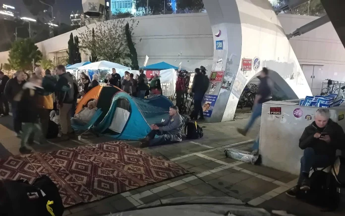 Para pengunjuk rasa yang menentang pemerintah Israel dan mendukung kesepakatan pembebasan sandera mendirikan tenda untuk bermalam di luar markas besar IDF di Kirya, Tel Aviv.