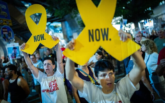 Para pengunjuk rasa menuduh Ben Gvir “membiarkan para sandera mati” dan menyebutnya sebagai “penghindar wajib militer”, merujuk pada masa mudanya ketika ia dilarang bergabung dengan militer karena aktivitas ekstremis.