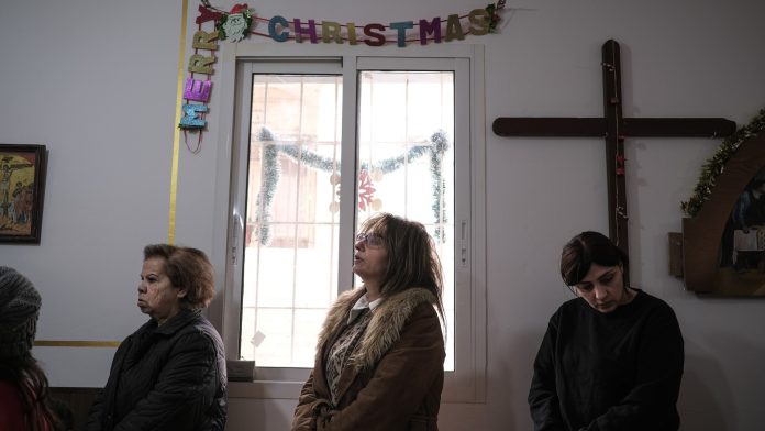 Di Derdghaya, hiasan Natal berkilau terombang-ambing diterpa angin. Sekitar 30 warga lanjut usia pulang ke rumah masing-masing usai misa, termasuk Takla Nahhas yang berlindung di rumah tanpa pemanas.